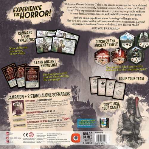 Το Mystery Tales είναι η δεύτερη μεγάλη επέκταση για τον Robinson Crusoe:Adventures on the Cursed Island , που περιέχει 2 διαφορετικούς τρόπους παιχνιδιού. Οι παίχτες θα μπορούν να παίξουν ένα Campaign με μία ιστορία που δε θα ξεχαστεί εύκολα, ολοκληρώνοντας ένα-ένα τα σενάρια. Οι παίκτες θα βιώσουν επίσης το Robinson Crusoe όπως δεν το έχουν ξαναβιώσει, εμπλουτίζοντας το βασικό τους παιχνίδι και ανανεώνοντας τα ήδη γνωστά σενάρια, με ένα καινούριο Horror Mode. Επιπλέον, υπάρχουν δύο ανεξάρτητα Σενάρια στο κουτί, εκ των οποίων το ένα έχει σχεδιαστεί να παιχθεί σε Horror Mode. Τα περισσότερα από τα περιεχόμενα αυτής της επέκτασης χρησιμοποιούνται τοσο σε Campaign όσο και σε Horror Mode αλλά έχετε υπόψιν ότι μερικά προορίζονται αποκλειστικά για το Campaign.