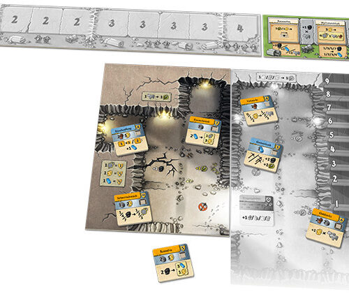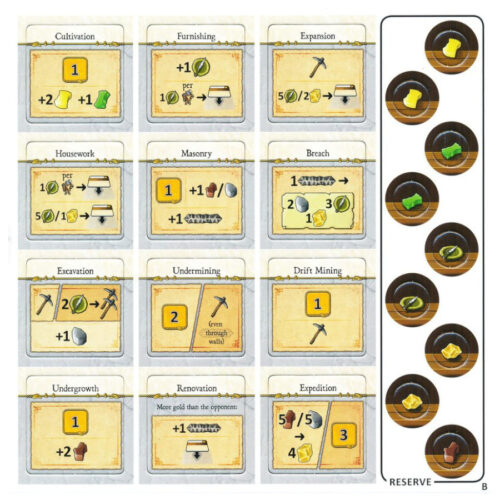 Πιο λεπτομερέστερα, κάθε παίκτης ξεκινάει το παιχνίδι με ένα ατομικό ταμπλό το οποίο είναι καλυμμένο με μία τυχαία σειρά κλειστών πλακιδίων τα οποία αναπαριστούν δωμάτια και μόνο ένα χώρο. Ορισμένα πλακίδια είναι ανοιχτά και διαθέσιμα για αγορά στην αρχή. Τέσσερα πλακίδια ενεργειών είναι επίσης ανοιχτά. Στην αρχή του κάθε γύρου, ένα νέο πλακίδιο ενεργειών αποκαλύπτεται και οι παίκτες εκτελούν ενέργειες, με τον αριθμό των ενεργειών να αυξάνεται από δύο μέχρι τέσσερις κατά τη διάρκεια του παιχνιδιού. Καθώς οι παίκτες “σκάβουν” το ταμπλό τους, καινούρια κτίρια/ δωμάτια προστίθενται. Κάποια μάλιστα δωμάτια μπορούν να χρησιμοποιηθούν αμέσως όταν αυτό αποκτάται, ενώ άλλα απαιτούν ξεχωριστή ενέργεια.