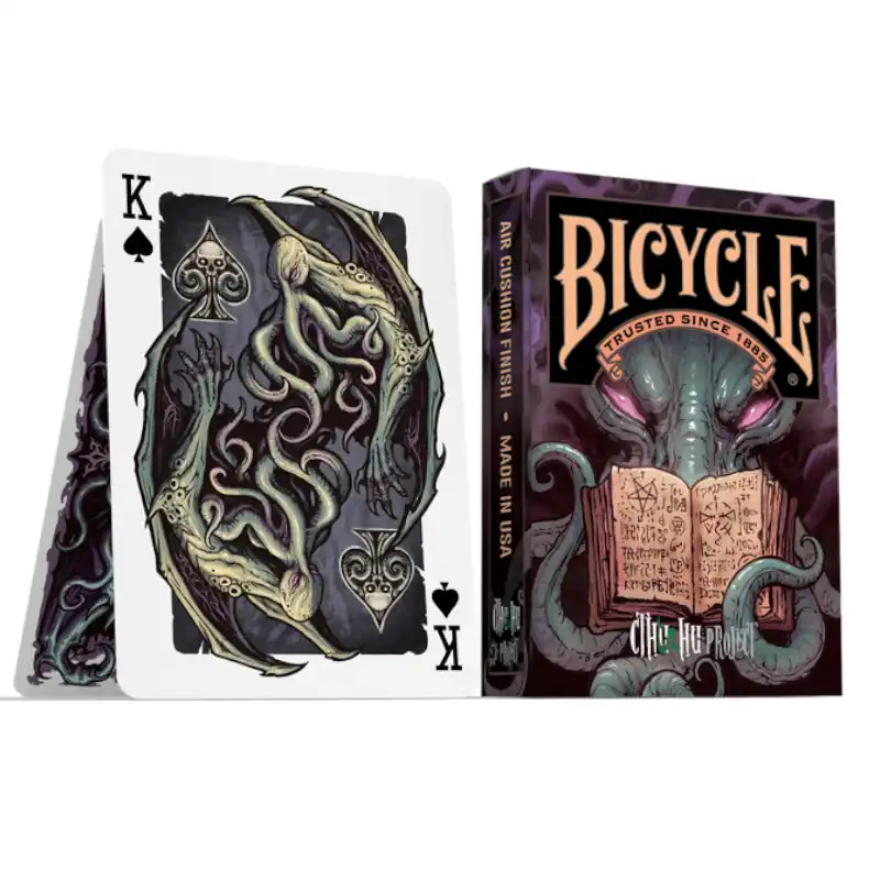 Τυπωμένη από την United States Playing Card Company (USPCC) πάνω σε premium Bicycle® Paper Stock με Magic Finish, η Bicycle Cthulhu προσφέρει άψογο φινίρισμα και εξαιρετική αντοχή για συλλέκτες, παίκτες αλλά και λάτρεις του Lovecraft. Η τράπουλα κυκλοφορεί σε δύο εκδόσεις – Bicycle Edition & Necronomicon Edition, ώστε να διαλέξεις αυτή που ταιριάζει στη συλλογή σου.