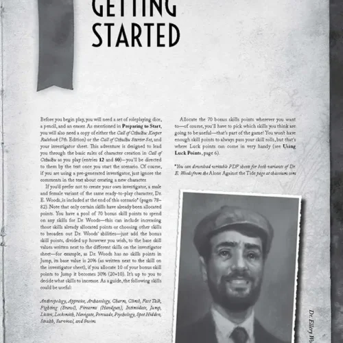 Στο Call of Cthulhu RPG- Alone Against the Tide μπορείτε να επιλέξετε να δημιουργήσετε τον δικό σας ερευνητή ή να χρησιμοποιήσετε τον έτοιμο ερευνητή, τον Dr. E. Woods, καθηγητή αρχαιολογίας του Miskatonic University. Υπάρχουν διάφοροι λόγοι για την επίσκεψη στο Esbury, αλλά σχεδόν όλοι συνδέονται με κάποιον τρόπο με τον κάτοικο του Esbury, τον καθηγητή William Harris.
