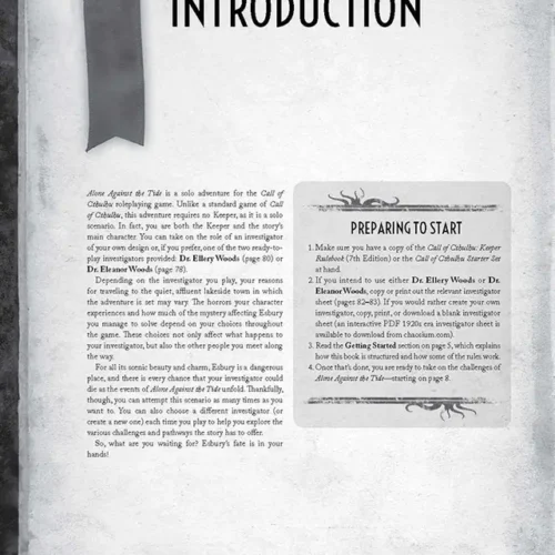Το Call of Cthulhu RPG- Alone Against the Tide διαδραματίζεται στη δεκαετία του 1920. Είναι μια περιπέτεια τρόμου για το παιχνίδι ρόλων Call of Cthulhu. Αναλαμβάνετε το ρόλο ενός ερευνητή που ταξιδεύει στην εύπορη, γραφική και απομακρυσμένη παραλίμνια πόλη Esbury της Μασαχουσέτης. Εσείς αποφασίζετε την πορεία σας μέσα στην ιστορία επιλέγοντας από τις επιλογές που παρουσιάζονται. Οι επιλογές σας δεν επηρεάζουν μόνο το τι θα συμβεί στον ερευνητή σας. Επηρεάζει και τη μοίρα των κατοίκων και των επισκεπτών του Esbury. Ακόμα και της ίδιας της πόλης!