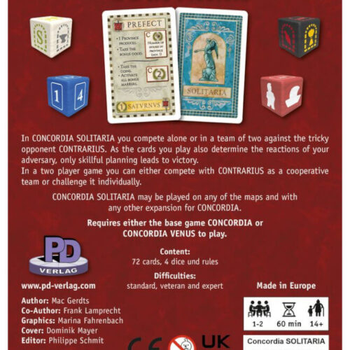 Στο CONCORDIA SOLITARIA αγωνίζεστε μόνοι σας ή σε μια ομάδα δύο ατόμων ενάντια στον ύπουλο αντίπαλο CONTRARIUS. Καθώς οι κάρτες που παίζετε καθορίζουν επίσης τις αντιδράσεις του αντιπάλου σας, μόνο ο επιδέξιος σχεδιασμός οδηγεί στη νίκη.
