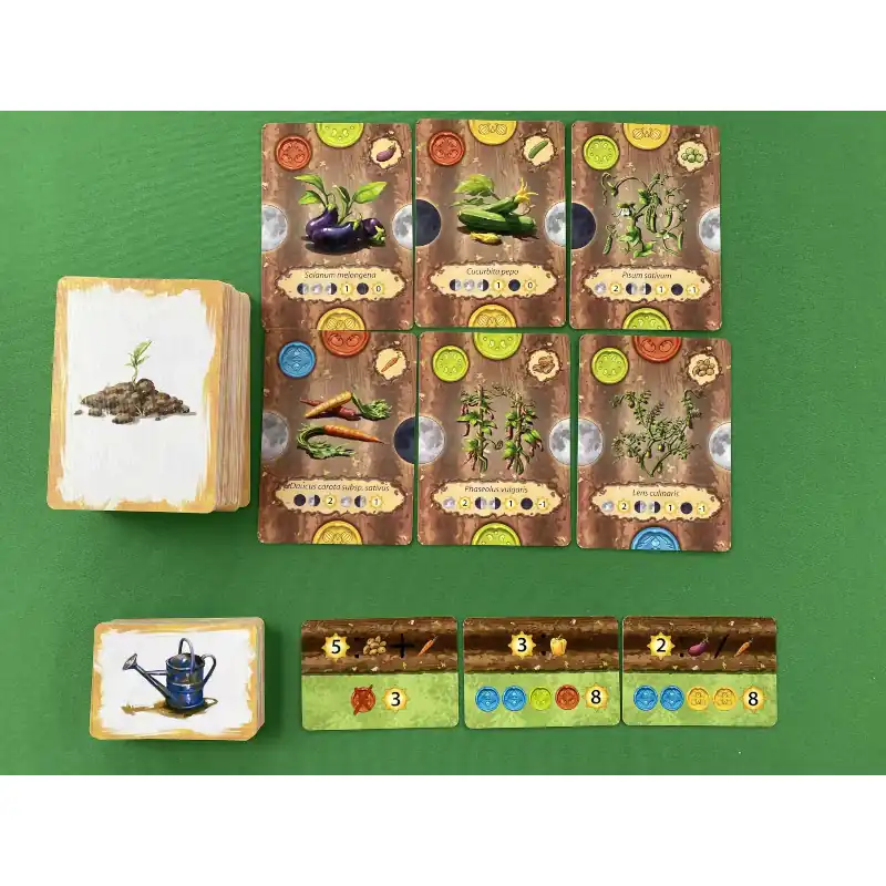 Crops is a strategic farming card game where players build a 3×4 vegetable field using crop and goal cards. Plan your harvest carefully, as moon phases affect your final score! Combine crop families, achieve objectives, and become the top farmer in this grid-building board game full of nature and smart planning.