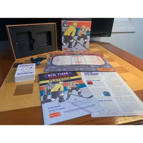 The Big Time Hockey board game by Pungo Games is in English, with minimal language dependence, and is ideal for sports fans of all ages 10 and up. Put on your skates, grab the puck, and get ready for tabletop hockey action like you have never experienced before!