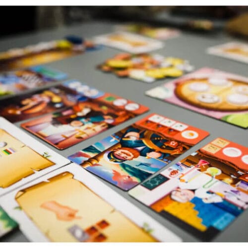 At the end of each round, a player may complete a tea order from a customer card that they have in hand or that is visible on the deck customers. A basic token of tea, the tea flavors and add-ins shown on the card are the required ingredients and are placed into an empty teacup. The player flips over a tip and receives a coin bonus, moving the thermometer's round tracker up one step if all the cups are filled.
