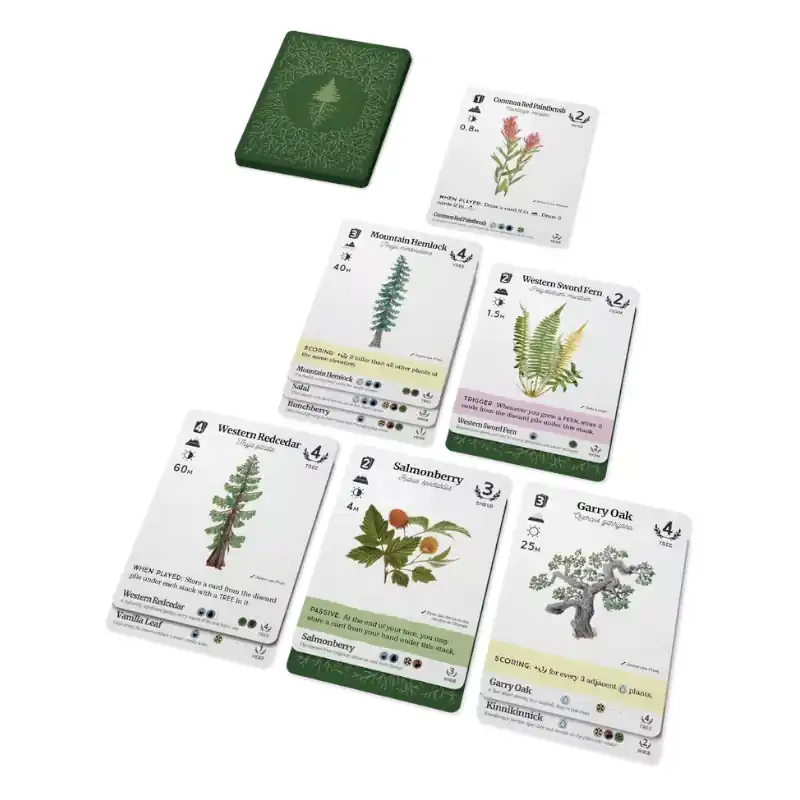 In the Reforest board game, players are challenged to develop a dynamic forest by placing plant cards at different elevation levels (low, middle, high). Each plant has unique properties and abilities, creating synergies that strengthen your ecosystem. Proper placement and card combinations are the key to victory in this strategic card game.