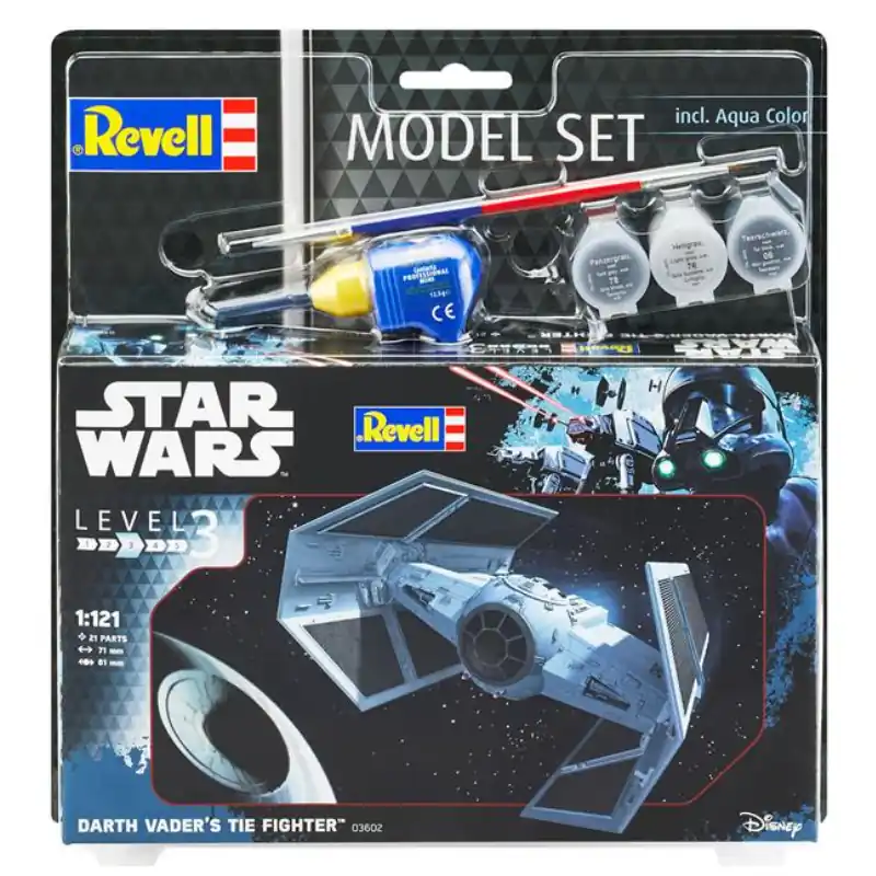 Build Darth Vader’s TIE Fighter with this official Revell model kit (1:121 scale). Includes 21 parts, glue, brush & paints. Perfect for Star Wars fans and collectors.
