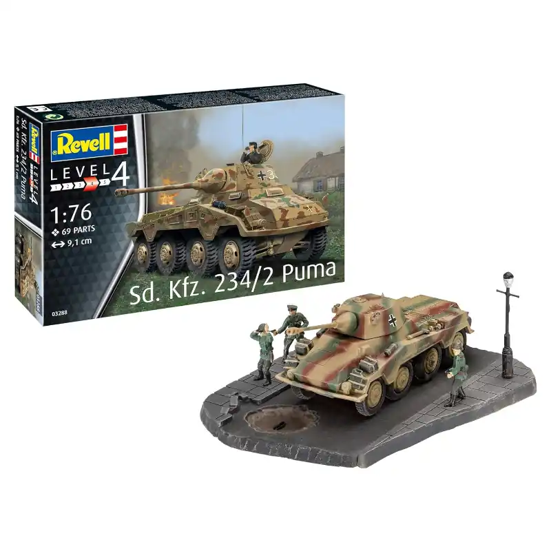 Build the iconic Revell Sd.Kfz. 234/2 Puma 1:76 model kit, a detailed WWII German armored vehicle plastic model. Featuring 69 parts, realistic decals, figures, and display base, this military scale model is perfect for collectors and hobbyists. Ideal for World War II model enthusiasts, scale modeling fans, and Revell model kit builders aged 12+.