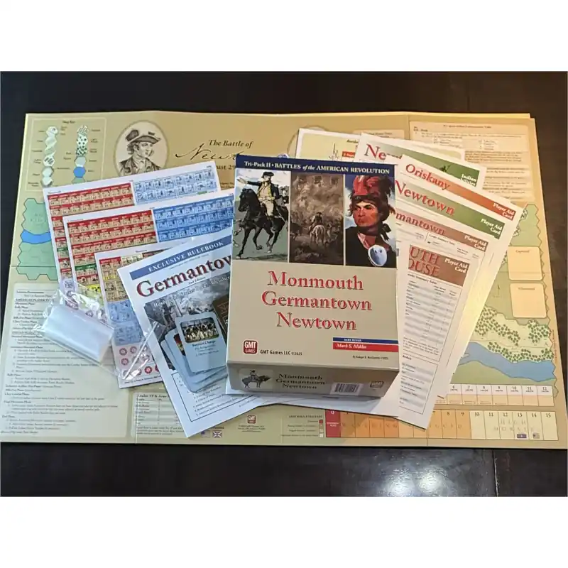 Monmouth Germantown Newtown is a historical wargame tri-pack from GMT Games, featuring three key battles from the American Revolutionary War. With tactical regimental-scale gameplay and hard-mounted maps, it’s perfect for strategy game collectors and GMT wargame fans.
