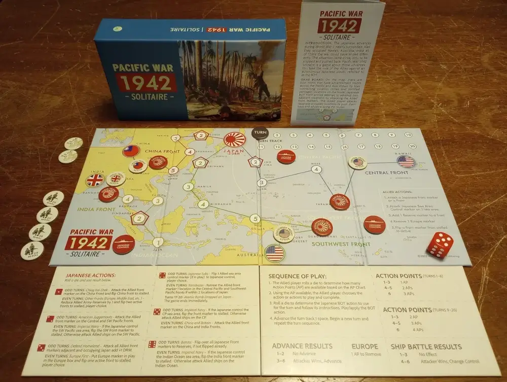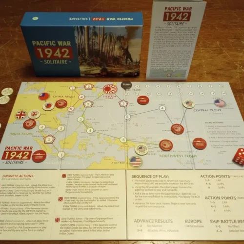 Το Pacific War 1942: Solitaire είναι ένα καθηλωτικό επιτραπέζιο παιχνίδι στρατηγικής, σχεδιασμένο για έναν παίκτη, που σε μεταφέρει στο επίκεντρο του Β’ Παγκοσμίου Πολέμου στον Ειρηνικό Ωκεανό. Ως διοικητής των Συμμαχικών δυνάμεων, καλείσαι να αποκρούσεις την ιαπωνική επίθεση και να ανακαταλάβεις εδάφη που έχουν κατακτηθεί. Το παιχνίδι βασίζεται σε πραγματικά ιστορικά γεγονότα του 1942 και προσφέρει συναρπαστικό gameplay με έντονες στρατηγικές αποφάσεις.
