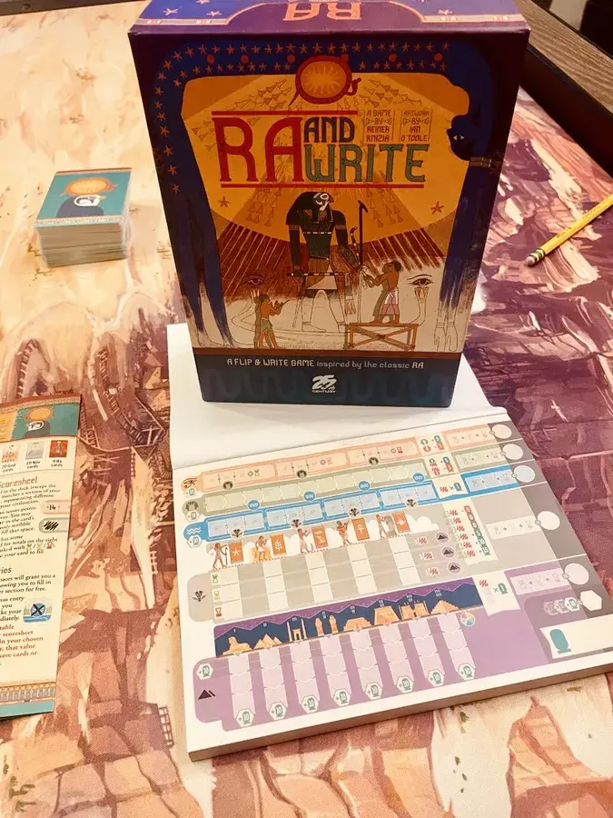 Το RA and Write από τον θρυλικό σχεδιαστή Reiner Knizia είναι ένα καινοτόμο flip-and-write επιτραπέζιο παιχνίδι που βασίζεται στο κλασικό RA board game. Κυκλοφορεί από την 25th Century Games με το εντυπωσιακό artwork του Ian O’Toole και προσφέρει την αυθεντική αιγυπτιακή εμπειρία σε compact μορφή.