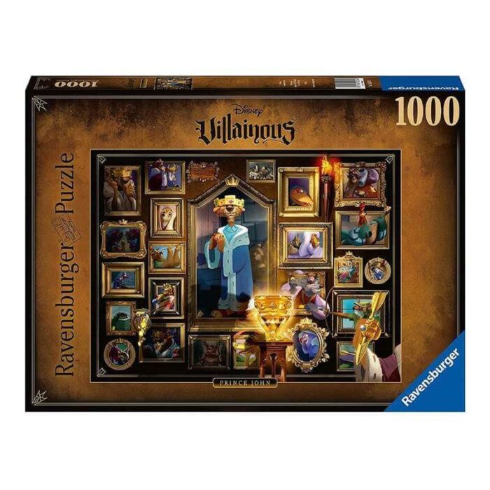 Το παζλ 1000 κομματιών της Disney Villainous King John περιλαμβάνει χαρακτήρες από τη διάσημη ταινία της Disney Robin Hood. Τοποθετημένο σε μια κορνίζα τοίχου με πορτρέτα του Ρομπέν, του King John & Co. Σε πρώτο πλάνο, η αντίστοιχη φιγούρα παιχνιδιού από το επιτραπέζιο παιχνίδι Villainous