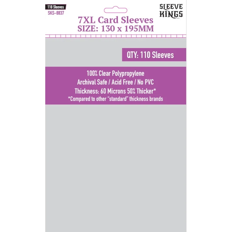 Εμπιστευθείτε την Sleeve Kings, μία από τις κορυφαίες μάρκες card sleeves για επιτραπέζια και TCG/LCG. Με πλήρη διαφάνεια, υψηλή ποιότητα και εύκολη τοποθέτηση, οι 7XL sleeves προσφέρουν την απόλυτη προστασία στα αγαπημένα σας components.