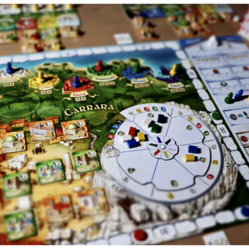 Στο The Palaces of Carrara, θέλετε να αγοράσετε μάρμαρο από αυτή τη διάσημη περιοχή της Ιταλίας όσο το δυνατόν φθηνότερα. Αλλά οποιαδήποτε μείωση της τιμής θα ωφελήσει και τους αντιπάλους σας. Ίσως να σας συμφέρει να επενδύσετε αντ’ αυτού στα κτίρια που δημιουργούνται από αυτό το αποκλειστικό μάρμαρο. Ίσως θα είναι πιο αποδοτικό να αρπάξετε την ακριβή πρώτη ύλη όταν τα μεγαλύτερα κτίρια της πόλης αποδειχθεί ότι δεν είναι τόσο προσοδοφόρα όσο ελπίζατε.
