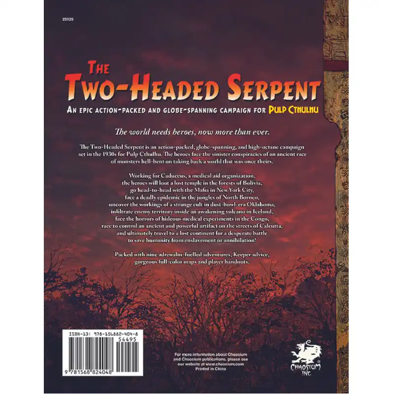Το The Two-Headed Serpent είναι μια επική, γεμάτη δράση καμπάνια τρόμου για το Call of Cthulhu και συγκεκριμένα για την έκδοση Pulp Cthulhu, που εκτυλίσσεται τη δεκαετία του 1930. Σε αυτή τη συναρπαστική εκστρατεία, οι παίκτες ενσαρκώνουν ήρωες με αυξημένες δυνατότητες, αντιμετωπίζοντας σκοτεινές δυνάμεις και αρχαίες απειλές σε ένα παγκόσμιο σκηνικό.