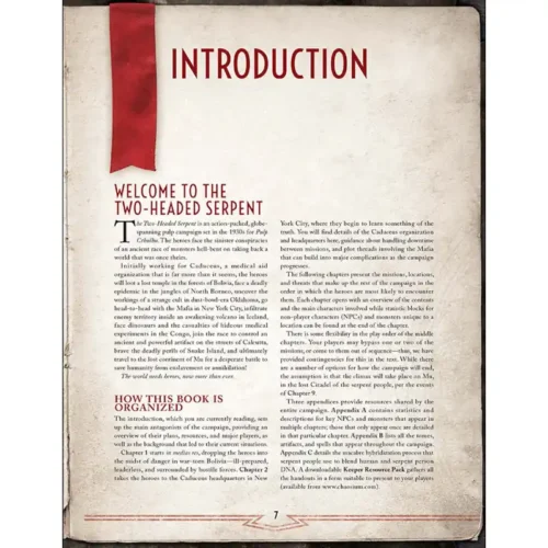 Το The Two-Headed Serpent campaign book προσφέρει πλούσια πλοκή, έγχρωμους χάρτες, χάρτινα βοηθήματα για τους παίκτες και οδηγίες για τον Keeper (τον αφηγητή του παιχνιδιού). Αν και είναι σχεδιασμένο για το Pulp Cthulhu, μπορεί να προσαρμοστεί και για το βασικό σύστημα Call of Cthulhu 7ης έκδοσης.