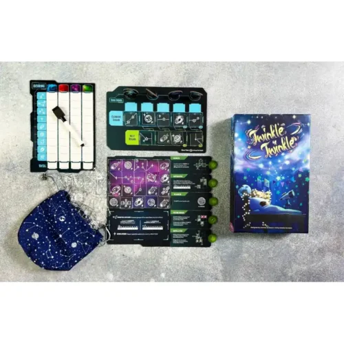 Το Twinkle είναι ένα οικογενειακό επιτραπέζιο στρατηγικής με πλακίδια (tile-laying game) που μεταφέρει μικρούς και μεγάλους σε έναν μαγευτικό νυχτερινό ουρανό. Οι παίκτες καλούνται να συνθέσουν αστερισμούς, να συλλέξουν πλανήτες, κομήτες, δορυφόρους και να αποφύγουν… τις μαύρες τρύπες!